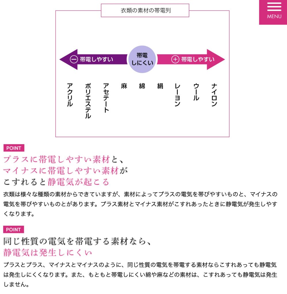 肌は基本的にマイナスに帯電しているので、ナイロンなどは素肌に直接着るだけで静電気が起きてしまうということになりますね。